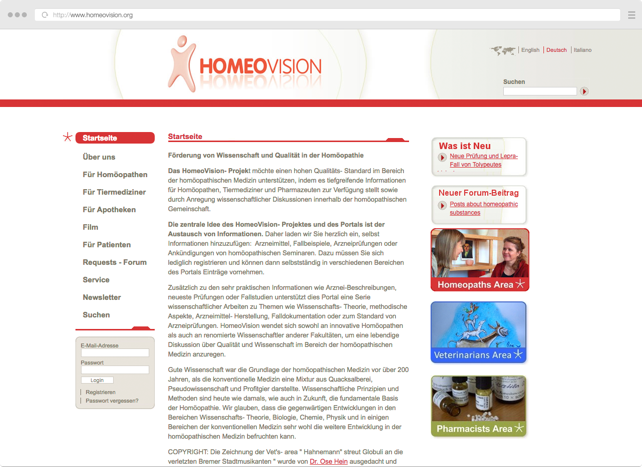 Das Portal Homeovision ist in deutscher, englischer und italienischer Sprache und bietet so nicht nur für deutschsprachige Homöopathen, Tiermediziner, Pharmazeuten und andere Wissenschaftler einen großen Mehrwert, sondern kann auch von der homöopathischen Gemeinschaft weltweit genutzt werden. Die Internetpräsenz von Homeovision wurde Ende Juni 2019 bis auf Weiteres geschlossen.